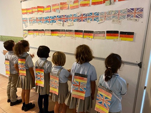 Los estudiantes de 1º de Primaria escribieron palabras bonitas encima de sus manos recortadas y también pintaron banderines con las banderas europeas y con ellos hicieron guirnaldas; en 2º también realizaron banderas que usaron para decorar el pasillo y para llevar a modo de colgante a casa; 3º reflejó la bandera europea y cada alumno escribió diferentes palabras que asocian con Europa o con los diferentes idiomas dentro de una estrella; 4º realizó unos cómics sobre los malentendidos que pueden surgir cuando no hablamos idiomas; y 5º dibujó y recortó personajes y frases formando un circulo que simboliza el entendimiento entre las personas y los países.